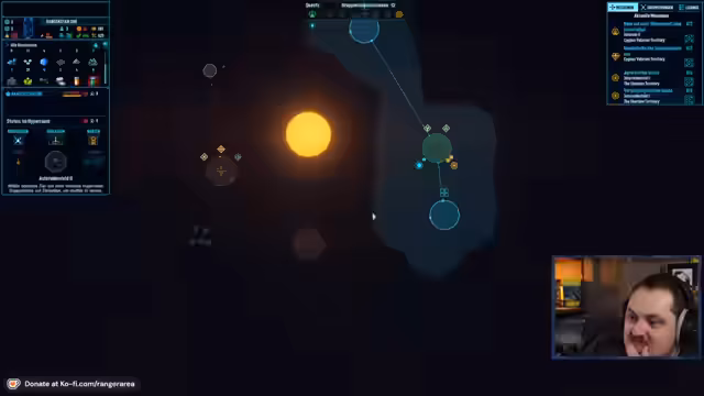 01:32:02Nach diversen Handelsversuchen und Pannen startet das Schiff einen Hyperraumsprung ins Sheridan Territorium, um dort eine Agrarstation zu bauen. Diese Mission, die zur Wiederherstellung der Nahrungssicherheit beitragen soll, wird jedoch von einem feindlichen Militär-Allianz unterbrochen. Sie bietet eine Mission an, einen ganzen Sonnensystem-Cluster auszukundschaften, was die Prioritäten des Streams verändert und zu einem neueren, komplexeren Ziel führt.