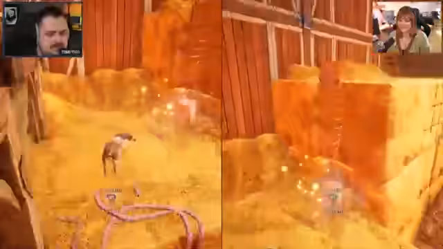 03:50:06Die Spieler nehmen an einer Nebenmission teil, bei der sie verhindern müssen, dass ein Bombenzug sein Ziel erreicht. Dies führt zu einer rasanten Sequenz, die an Subway Surfer erinnert. Es folgt eine weitere Nebenmission, die an Space Invaders erinnert, in der die Spieler Power-Ups sammeln und gegen Gegner kämpfen müssen. Eine weitere Herausforderung besteht darin, eine simulierte Version der Welt vor Raiders zu schützen. Die Spieler lösen Rätsel mit Küken und Eiern und müssen in einer Simulation feststellen, dass sie gefangen sind. Es wird sich über die unsympathische Art einer Spielfigur namens Fürst Immergrün lustig gemacht. Die Streamer stoßen auf verschiedene Gameplay-Mechaniken, darunter das Verschmelzen mit der Natur und das Lösen von Rätseln, um voranzukommen.