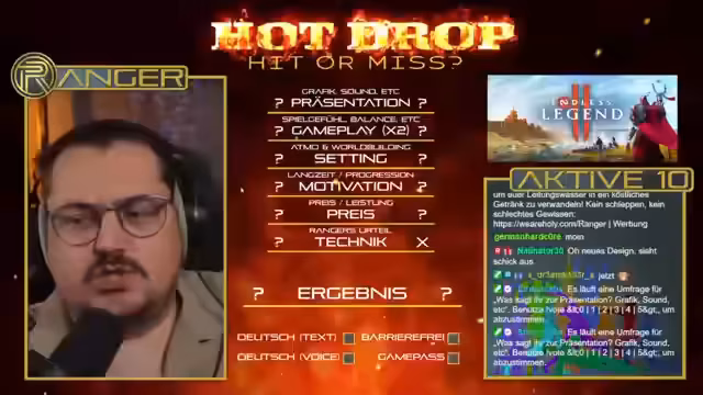 04:08:22Nach dem ersten Gameplay-Abschnitt stellt der Streamer das wöchentliche Format 'HotDrop' vor, bei dem drei neue Spiele im Ersteindruck bewertet werden. Es folgt die systematische Wertung für Stormgate, die in die Kategorien Präsentation, Gameplay, Setting, Motivation und Preis-Leistung unterteilt wird. Die Zuschauer werden via Bot aufgefordert, für die Kategorien abzustimmen. Der Streamer selbst gibt persönliche Noten ab, wobei er die Präsentation und Story kritisiert, das Gameplay jedoch positiv bewertet. Die finale Bewertung des Streams ist gemischt: Die Zuschauer sehen das Spiel in der 'Wackelzone', der Streamer bewertet es als 'Miss'.