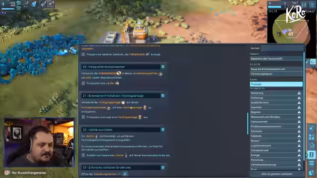 00:41:24Nachdem die technischen Vorbereitungen abgeschlossen sind, startet der Streamer das Spiel Desync, das kürzlich die Version 1.0 erreicht hat. Er beschreibt es als eine Art Factorio-ähnlichen City Builder, der jedoch komplett durch Drohnen gesteuert wird, anstatt einer Bevölkerung. Die Steuerung erfolgt über ein Logistiknetzwerk. Nach einer kurzen Einführung durch die KI Elaine landet der Streamer auf dem Planeten und beginnt, eine Kommandozentrale zu bauen. Er erklärt die grundlegende Funktion des Netzwerks, in dem Ressourcen von Einheiten wie Läufern transportiert werden, und baut seine erste Produktionskette für Metallbarren auf, um die Basis zu erweitern.