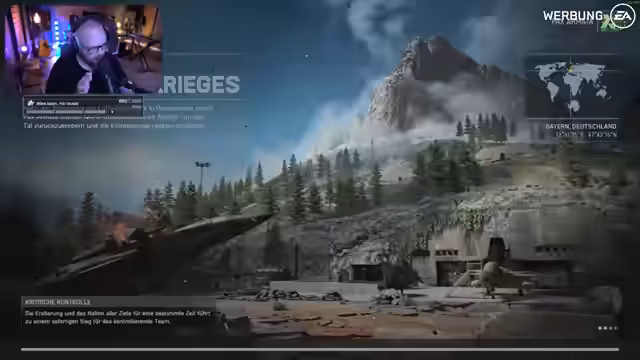 00:04:36Nach dem Einstieg ins Spiel wählt der Streamer die neue Map 'Germany' für einen Eroberungsmodus aus. Er startet als Pionier mit der SG-553R und beschreibt seine erste visuelle Einschätzung der Karte als sehr hübsch und abwechslungsreich. Er bemerkt sofort den neuen Helikopter AH-6 Little Bird, der einen großen Reiz auf ihn ausübt, und stellt fest, dass die Karte sich bislang angenehmer und weniger chaotisch als erwartet spielt, da es nicht sofort zu einem großen Truppenansturm kommt.