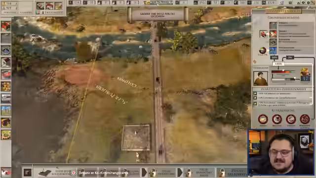 01:18:27Der Stream beginnt mit einem Interaktionsmoment, bei dem der Streamer durch einen Bestechungsversuch gegenüber dem Stadthalter Land für eine neue Kolonie erlangt. Die Auguren haben den Ort bereits als günstig eingestuft und der Stadthalter gibt zusätzlich Baumaterial mit. Nach einer kurzen Verwirrung über den Namen, der letztendlich Victus lautet, und die Keltengräber, die anfangs den Bau behindern, wird der Grundstein für die erste römische Siedlung gelegt.