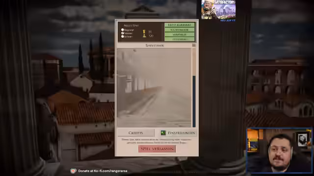 01:05:42Der Story-Modus von Pax Augusta beginnt mit dem Tod von Julius Caesar und dem Aufstieg von Octavian (Augustus). Der Streamer wählt die Tugend "Der Sparsame", die sich positiv auf seine Karriere auswirken soll. Es wird kurz über den römischen Begriff "Aques" gerätselt, der sich als "Pferd" herausstellt. Das Spiel beginnt mit einem Brief der Eltern, in dem sie den Streamer bitten, nicht zu lange in der Stadt zu bleiben und nach Hause zu kommen. Der Kaiser habe die Meilensteine erneuert, die nun den Weg weisen. Der Streamer soll nach Vesoncio reisen. Auf dem Weg dorthin verliert er sein ganzes Geld durch ein zufälliges Ereignis. In Vesoncio angekommen, soll er seinem Vater beim Bau eines Tempelbezirks helfen. Er soll Schreine errichten und diese mit der Taste "R" drehen. Die Stimmen im Spiel sind sehr leise.