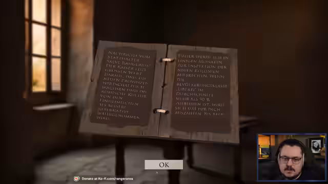 01:00:36Nach einer kurzen technischen Unterbrechung beginnt der Stream mit dem eigentlichen Gameplay von 'Pax Augusta'. Er stellt das Spiel als Projekt vor, das von einer einzigen Person namens Roger nach Feierabend entwickelt wurde und in der Tradition alter Sierra-Spiele wie Cäsar steht. Der Streamer startet den Story-Modus, erstellt seinen römischen Charakter 'Rangirius Arianus' und beginnt mit der Ersteinrichtung seines Anwesens. Eine erste Mission besteht darin, einen Schrein für den Vater zu errichten, was erste grundlegende Baumechaniken des Spiels zeigt. Der Sound des Spiels wird als leise und teilweise unverständlich kritisiert.
