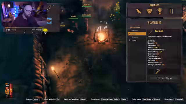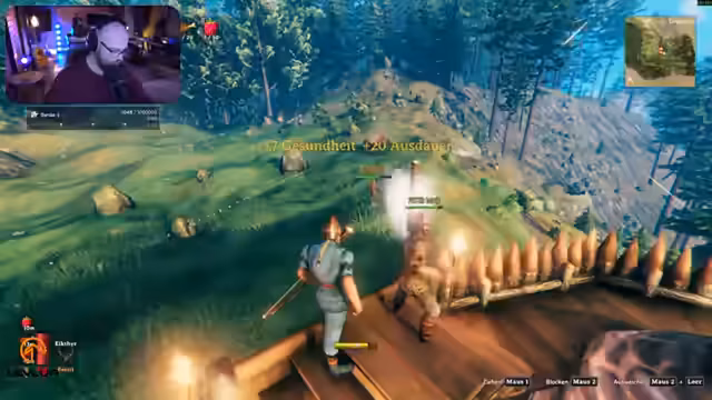 00:52:03Nach dem Tutorial-Gespräch mit dem Raben (Hugin) begibt sich der Streamer auf die Suche nach Ressourcen. Er kämpft gegen Gegner wie Gräulinge und Wildschweine, sammelt Materialien und craftet eine Steinaxt sowie einen Hammer. Diskussion mit Darky über Base-Bau und Strategien. Es wird eine Kochstelle am Wasser gebaut und erste Mahlzeiten gekocht.