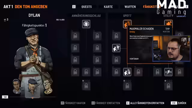 01:34:19Nach einem Kampf öffnet sich ein Menü, das die Fähigkeiten der Charaktere detailliert zeigt. Jeder Torn hat zwei individuelle Fähigkeitsbäume sowie einen gemeinsamen Utility-Baum. Fähigkeiten wie "Kill-Unterstützung", die Vivian AP zurückgibt, oder "Feuerschuss", die Leo AP auf Verbündete überträgt, werden erklärt und zeigen ein taktisch vielschichtiges System. Der Streamer erkennt, dass die Charaktere sich voneinander synergistisch unterstützen können.