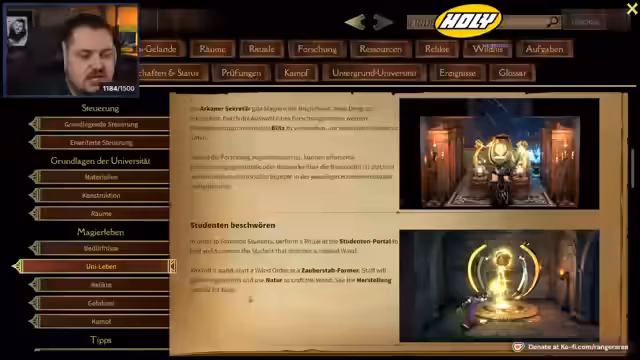 01:19:33Mind Over Magic wird als ein von Zuschauern häufig empfohlenes Spiel vorgestellt, das von Clay gepublisht wurde (bekannt für Don't Starve und Oxygen Not Included). Im Spiel baut man eine eigene Zauberschule, ähnlich Hogwarts. Das Spiel ist seit zwei oder drei Wochen im 1.0 Full Release verfügbar und wird im Stream erstmalig gespielt. Das Spiel ist ursprünglich nicht auf Deutsch, aber eine Community-Übersetzung ist über den Steam Workshop verfügbar. Der Schwierigkeitsgrad wird auf Standard gesetzt, und als Ziel wird der Bau einer großen Schule, ähnlich Hogwarts, festgelegt. Es werden drei Streams mit insgesamt etwa 15 Stunden Spielzeit eingeplant. Zu Beginn wählt man drei Charaktere mit unterschiedlichen Fähigkeiten aus den Bereichen Feuer, Wasser, Dunkelheit, Natur, Erde, Blitz und Luft. Die Universität wird gegründet und erhält den Namen Rangers-Tahn-Universität für Volkshexerei. Im ersten Schritt wird das Ritual Nebel vertreiben an der Manaquelle durchgeführt, um den Nebel zurückzudrängen und neue Ressourcen sichtbar zu machen.
