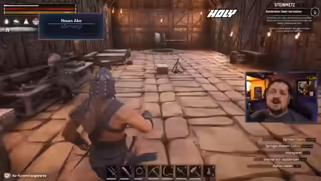 05:23:33Der Stream wechselt zu 'Conan Exiles', ein Open-World-Survival-Aufbauspiel. Der Streamer stellt das Spiel vor und beginnt damit, seine Basis zu erweitern und unfreiwillige Mitarbeiter zu rekrutieren. Er baut einen Steinmetz aus, um gehärteten Stein für fortgeschrittene Gebäude herzustellen, und startet die Pferdezucht neu. Der Fokus liegt auf dem Aufbau einer riesigen Stadt mit vielen Bewohnern.