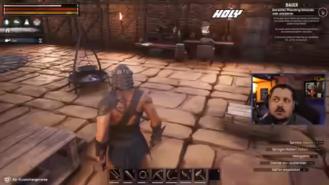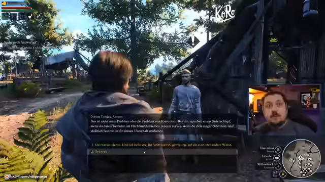 00:47:39Der Streamer trifft eine wichtige strategische Entscheidung für den Standort seiner Siedlung. Er entscheidet sich, sich etwas vom ersten Dorf zu entfernen, um nicht in dessen Einflussbereich zu geraten, und wählt einen Ort in der Nähe eines Flusses, um den Zugang zu Wasser zu sichern. Nachdem die erste Hütte errichtet ist, begegnet er den ersten Dorfbewohnern und erhält seine ersten Quests. Er interagiert mit dem Dorfältesten und sucht nach einem Jäger namens Lubomir, um die erste Mission in die Wege zu leiten. Dabei stellt er die KI-Sprache des Spiels infrage.