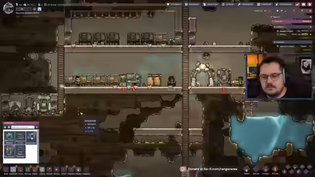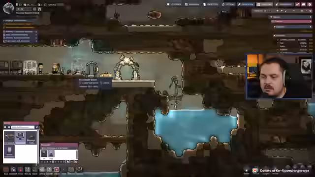 01:25:49Da die Duplikanten nur Nahrung benötigen, um zu überleben, wird die Produktion von Matschriegeln mittels eines Mikromatschers anlaufen. Gleichzeitig wird die kritische Sauerstoffversorgung adressiert, indem ein Algenterrarium gebaut wird, das Algen in Sauerstoff umwandelt. Ein Forschungstisch wird eingerichtet, um zukünftige Blaupausen wie einen Acker für nachhaltigere Nahrungsproduktion freizuschalten.