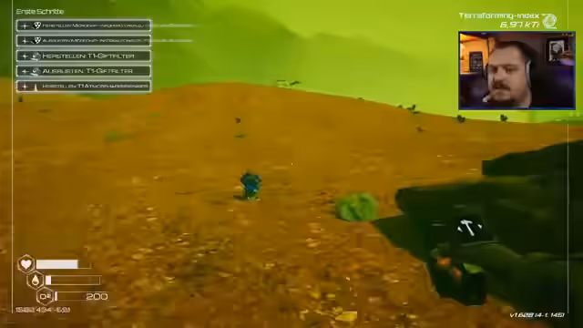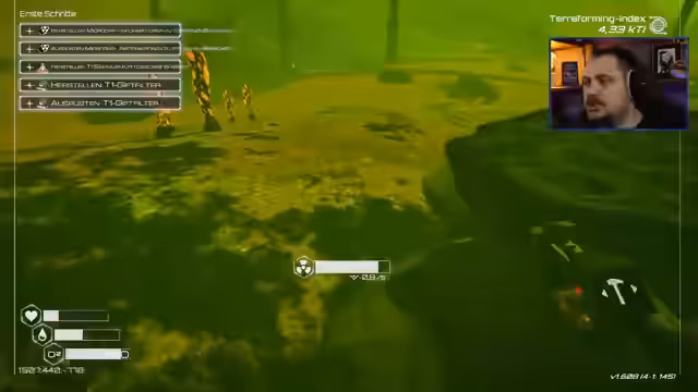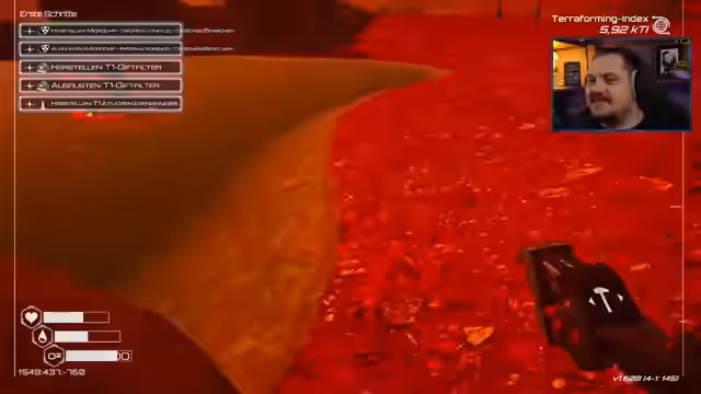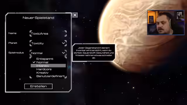 00:37:42Nach einer kurzen Aufforderung an das Publikum, 'Ranger' zu rufen, beginnt der Streamer mit dem Spiel. Er wählt den Schwierigkeitsgrad 'intensiv', bei dem das Inventar bei jedem Tod verloren geht und Ressourcen schneller verbraucht werden. Die ersten Schritte sind geprägt von der Notwendigkeit, Sauerstoff zu finden und grundlegende Überlebenswerkzeuge herzustellen, um der giftigen Atmosphäre zu entgehen.