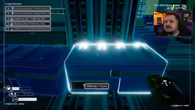 01:03:36Nachdem eine Energiequelle von 1,2 Kilowatt betrieben wird, beginnt das eigentliche Terraforming. Ein Monitor zur Anzeige des Terraforming-Index (TI) wird aufgebaut. Um ein Exoskelett zur Erhöhung der Ausrüstungskapazität herzustellen, wird Kobalt benötigt. Der Streamer erkundet das Inventar, stellt fest, dass hauptsächlich Magnesium vorhanden ist, und beginnt mit der Produktion von Bauteilen wie Sauerstofftanks und dem Exoskelett. Die Notwendigkeit der Nahrungsproduktion wird als nächster wichtiger Schritt identifiziert.
