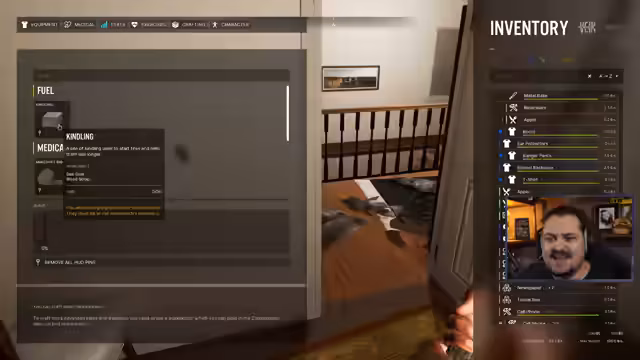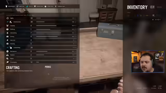 01:13:25Der Streamer erkundet das Haus und findet verschiedene Gegenstände wie Protektoren, einen Speer mit Marshmallows, Müll, Kürbis- und Tomatensamen. Er bemerkt die seltsame Uhrzeit (18:42 Uhr) und die Möglichkeit, im Haus zu schlafen. Beim Crafting entdeckt er, dass er eine Standard-Werkbank bauen kann, wofür Nägel und Holzschrott benötigt werden. Er plant, Holz durch das Zerlegen von Gegenständen zu erhalten und das gefundene Haus zu schützen. Die Musik im Spiel wird als seltsam empfunden und später leiser gestellt. Im Kühlschrank findet er Wodka und lernt, dass man Baupläne für Gegenstände finden kann, die man ab Level 35 Konstruktion bauen kann. Er fragt sich, wie er an Holz kommt und beschließt, erst einmal zu schlafen, um die Zeit zu überbrücken und Perks zu investieren.