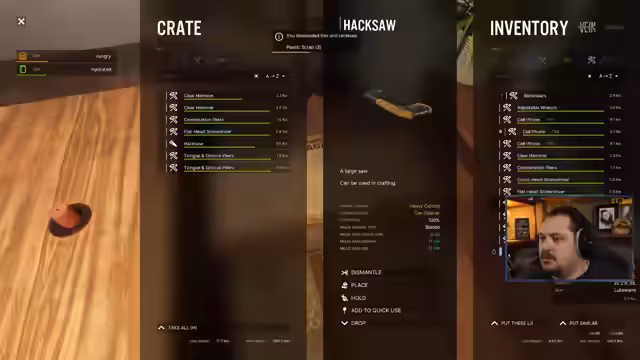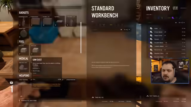 01:19:35Um die Werkbank zu bauen, benötigt der Streamer Woodscrap. Er findet heraus, dass er Holzschrott durch das Zerlegen von Gegenständen erhält. Er zerlegt vorhandene Gegenstände und sammelt acht Woodlocks. Durch das Zerlegen von Wänden erhält er Woodscrap und kann somit die Werkbank bauen. Er findet einen Fahrradhelm, der als Bauarbeiterhelm angezeigt wird, und einen Hexor (Säge), mit dem er Holzblöcke sägen kann. Er ist beeindruckt von seiner Intelligenz, diese Mechanik entdeckt zu haben. Nachdem er genügend Woodscrap gesammelt hat, kann er die Werkbank bauen. Er plant, als Nächstes ein Utility Cabinet zu bauen, das als Zentrum der Basis dient und gut bewacht werden muss.