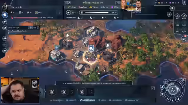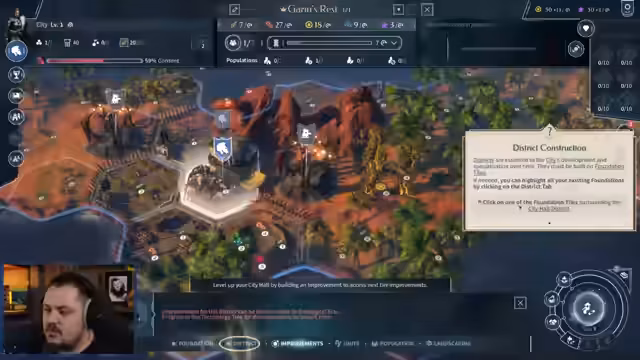01:09:26Der Streamer beginnt mit der Erkundung der grundlegenden Ressourcen des Spiels. Er identifiziert Geld, Produktion, Wissenschaft, Kultur und Einfluss als zentrale Säulen des Spiels. Ein besonderes Augenmerk liegt auf der Stadtentwicklung, die durch das Bauen von Foundations und Districts vorangetrieben wird. Es wird erklärt, dass Distrikte direkt auf den Stadtkarte gebaut werden müssen, wobei Fundamente als Grundlage dienen, und sich durch Forschung neue Bauoptionen wie Farms eröffnen, die durch Technologie wie 'Fencing' freigeschaltet werden.
