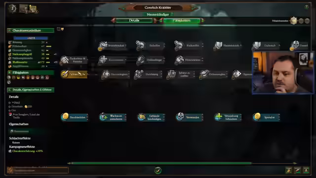 00:26:29Nachdem das Glücksrad die Skaven als spielende Fraktion auswählte, entscheidet der Streamer sich für den Clan Skrotz der Mutant, den er bisher noch nicht gespielt hat. Er gibt einen Überblick über die spezifischen Eigenschaften dieser Fraktion, wie Baukostensenkungen und passive Regeneration, und beginnt mit der Vorstellung des Kerngebäudes, des Fleischlabors, in dem Einheiten durch Mutationen verstärkt werden können, wobei das Risiko von Instabilitäten besteht.
