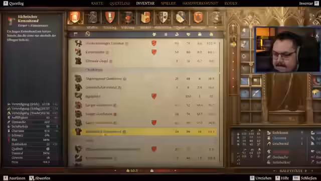 04:23:32Der Streamer steht vor der Herausforderung, das Inventar weiter zu reduzieren, um die 80 Gewichtseinheiten zu erreichen, die zum Reiten benötigt werden. Dies erfordert das Wegwerfen von wertlosem Nahrungsmitteln wie Hammelfleisch, Hundefleisch, Wolfsfleisch, billigem Wein, Kohlkopf, Wassermelonen, Karotten, Rote Beete und Zwiebeln. Selbst nach dieser Maßnahme ist das Gewicht immer noch zu hoch, weshalb ein Gambeson ebenfalls aussortiert wird. Während dieser Aktion wird im Chat nach Giveaway-Keys für Kingdom Come 2 gefragt und der Streamer unterhält sich mit der Chat-Community. Anschließend wird versucht, sich schnell auf das Pferd zu setzen, um den nächsten Schritt einzuleiten.