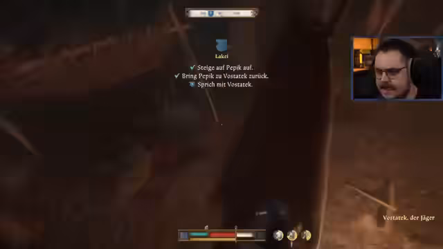 02:58:14Der Streamer nimmt die Suche nach dem Jäger Vostatec auf, der verletzt im Wald zurückgelassen wurde. Er findet ihn bei einem Ameisenhaufen und hilft ihm, nachdem dieser erklärt hat, dass sein Pferd namens Pepik von Wilderen gestohlen wurde. Vostatec beschreibt die Wilderer als eine kleine Bande und ihren Lagerort in der Nähe. Danach wird eine Bogenschule anvisiert, um Langbogen zu erlernen. Der Streamer findet einen Bogen und Pfeile und experimentiert mit dem Zielen, wobei ihm die Agilität für eine präzise Handhabung fehlt.