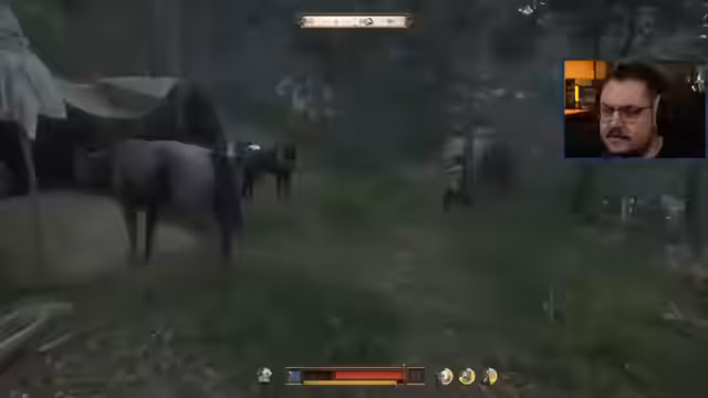 05:48:53Nachdem Pebbles wieder im Stall ist, beginnt das Ausrüstungspensum. Die neuen Gegenstände wie ein Sattel und Hufeisen werden ins Inventar aufgenommen und ihre Eigenschaften besprochen. Anschließend reitet der Streamer mit Begleiter Heinrich durch die Umgebung, um diese zu erkunden. Sie treffen auf verschiedene NPCs, darunter zwei Arbeiter, die sich mit ihnen anfreunden und ihnen lokale Neuigkeiten über einen verlorenen Wagen verraten.
