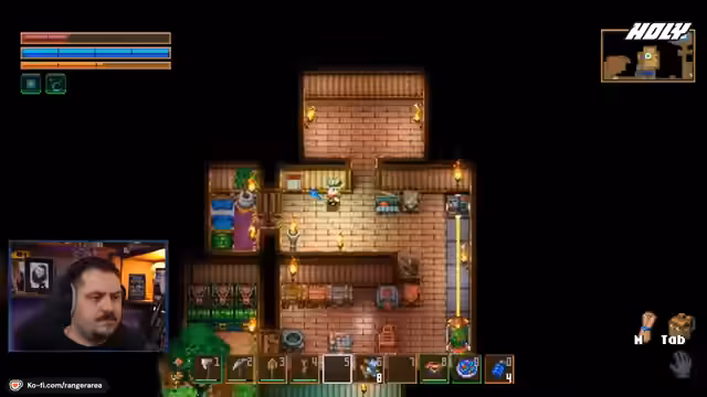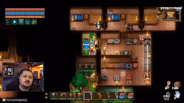 01:48:58Der Streamer probiert verschiedene Ausrüstungs-Set-Bonis aus und entdeckt neue Rezepte für Nahrungsmittel wie pilzigen Bärenpudding, die einen Status-Buff gewähren. Die Basis wird erweitert und verschönert; es werden Möbel wie ein Bett, ein Malertisch und ein Holzsauntor gebaut. Die erwähnt den Aufbau einer farmähnlichen Anlage mit Bombenpaprika. Nachdem er eine Laterne hergestellt hat, wird die Basis weiter ausgebaut, um mehr Platz und Ordnung zu schaffen.