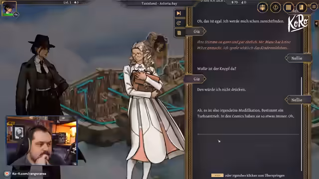 01:09:42Nach einem Sieg im Kampf äußert der Streamer seine Freude an der Spielmechanik und wechselt die Perspektive. Er interagiert mit den Charakteren Nelly und Gia. Nelly wird als eine nervige und charakterlich schwierige Person dargestellt, die im Gegensatz zur ruhigen und analytischen Gia steht, die dem Streamer sympathisch ist. Die Interaktion führt zu einer sehr zufälligen und abseitigen Konversation mit einem Kapitän über dessen Vergangenheit, was vom Streamer als 'random conversation' bezeichnet wird.