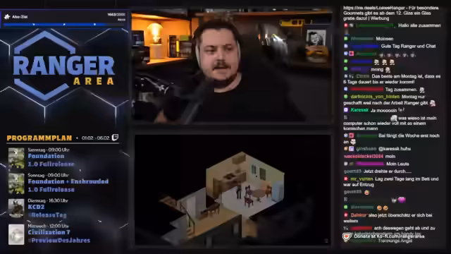 00:07:12Der Stream startet mit einer positiven Begrüßung zum Montagabend, der den erfolgreichen Start in die neue Woche symbolisiert. Es wird ein humorvoller Ausblick auf den Stream gegeben, gefolgt von Grüßen an die Zuschauer. Es folgt ein kurzer Exkurs über die vermeintliche Panik in Deutschland, wenn der Streamer offline ist, untermalt mit einem ironischen Bezug zur Bild-Zeitung. Der Streamer kokettiert mit seinem Image und spielt humorvoll mit Übertreibungen. Es wird ein selbstironischer Vergleich mit Gronkh gezogen und sich über positive Rückmeldungen gefreut. Es wird sich für Zaps und Subs bedankt und auf ein Cerveza-Kristall-Foto Bezug genommen. Der Streamer betont seine Energie und den Wunsch, die Zuschauer bei Laune zu halten, da der nächste Stream erst am Samstag stattfindet. Der Programmplan für die kommende Woche wird vorgestellt, einschließlich Foundation 1.0 Full Release am Samstag und Sonntag, Kingdom Come Deliverance 2 Release am Dienstag und Civilization 7 am Mittwoch. Es wird kurz auf Zomboid eingegangen und Fragen der Zuschauer beantwortet. Horror wird abgelehnt, aber Gesang versprochen. Es folgt eine kurze Interaktion mit den Zuschauern über Chat-Referenzen und Wünsche.
