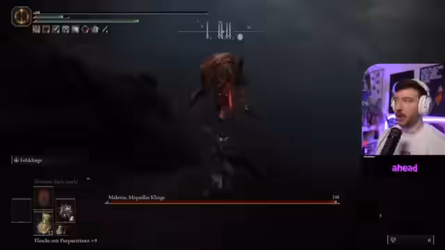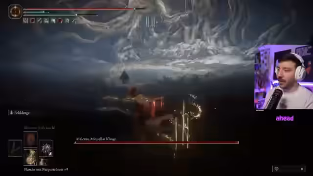 00:14:21Rappi beginnt mit den ersten ernsthaften Versuchen, Malenia zu besiegen. Er ist zwar enthusiastisch, wird aber schnell von der Schwierigkeit des Bosskampfes frustriert. Er berichtet, dass er Malenia bereits einmal im ersten Versuch besiegt hat, aber diesmal scheint er seine Taktiken vergessen zu haben. Der Streamer kämpft sich mühsam durch verschiedene Phasen des Kampfes, immer wieder unterbrochen von technischen Problemen und eigenen Fehlern.