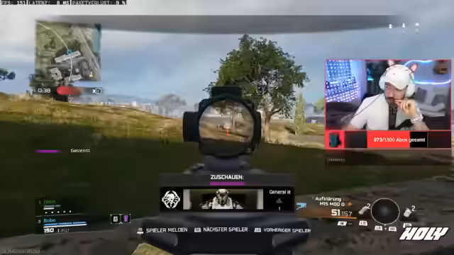 00:06:21Der Stream beginnt mit Musik und demStreamer begrüßt seine Zuschauer als Rappi. Er startet direkt ins Spiel und ist sichtlich überwältigt von der Action. In den ersten Minuten erlebt er einen "Nuke", eine sehr seltene und starke Waffe, und feuert wild auf Gegner. Nach einem Todeserlebnis und einer angespannten Situation mit einem Gegner, der ihn beinahe entdeckt hat, zeigt er sich erleichtert, nachdem er den Gegner eliminiert hat. Der Stream ist von hoher Aktivität und emotionalen Reaktionen geprägt.