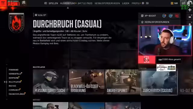01:21:47Nach dem erfolgreichen Test des 'Angriffspunkt'-Modus wechselt der Streamer zum 'Durchbruch Casual'-Modus, der für Neueinsteiger gedacht ist und Gameplay mit Bots sowie sechs echten Spielern pro Team bietet. Er sieht dies als perfekte Gelegenheit, seine Waffen zu leveln, da er in der vorherigen Runde mit elf Kills bereits ein Waffenlevel gemacht hat. Obwohl er erfahren hat, dass sechs Bots einem Spieler an EP entsprechen, hofft er, dass die höhere Anzahl an Kills dies ausgleicht. Er aktiviert eine Stunde Hardware-EP, um das Waffenleveling zu maximieren. Der Streamer stellt fest, dass die echten Spieler in diesem Modus sehr gut sind und ihn herausfordern, während er sich an die Controller-Steuerung gewöhnen muss. Er bemerkt, dass es wichtig ist, die Ziele zu halten, um nicht zu verlieren, und dass die Atmosphäre im Spiel trotz der Bots sehr intensiv ist.