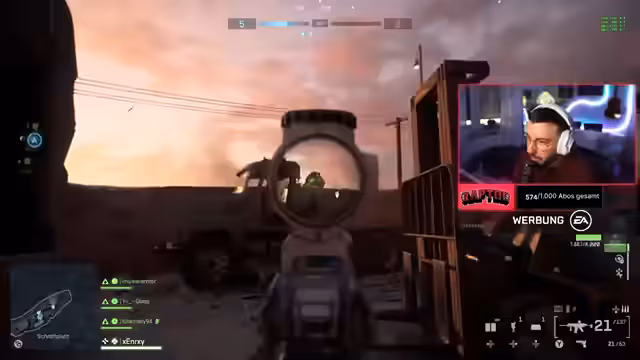 00:56:47Der Streamer kündigt offiziell an, dass das aktuelle Zwei-Stunden-Segment von EA und Battlefield gesponsert wird, um Season 1 von Battlefield 6 zu präsentieren. Er betont, dass der Multiplayer von Battlefield 6 weiterhin unterstützt wird und nicht aufgrund von Redsack vernachlässigt wird. Eine neue Waffe, die Scar als Karabiner, wird vorgestellt, die er bereits in Redsack etwas gelevelt hat. Er bedankt sich herzlich bei EA und Battlefield für die Ehre des Sponsorings und fordert die Zuschauer auf, ihre Unterstützung durch ein Herz im Chat und das Klicken auf den Tracking-Link unter '!BF6' zu zeigen. Der neue Modus 'Angriffspunkt' auf der Map 'Ölfelder' wird erneut gespielt, wobei er die Suche auf diese spezifische Map und Modus einschränkt, um die neuen Inhalte zu testen. Er gibt auch einen Ausblick auf kommende Maps am 18. und 9. Dezember.