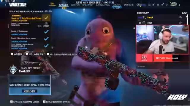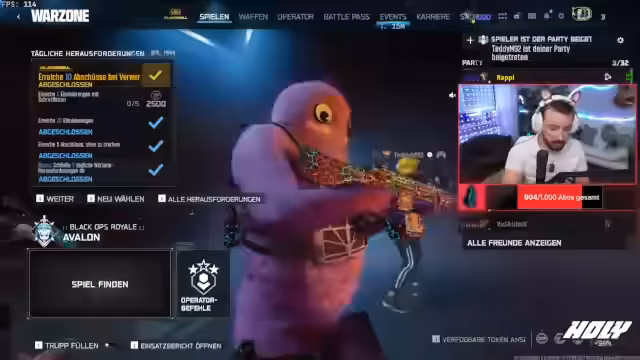 05:01:35Der Streamer teilt seine Gaming-Statistiken und -ziele mit der Community. Er erwähnt seine Kills, Deaths, Assists (AKD), Spielzeit und Anzahl der Siege. Dabei zeigt er Stolz auf seine Fortschritte wie eine 7-4-8-AKD in Blackout und eine 5er-Winstreak. Er spricht auch über das Nerfen von Prime-Reset und Ausblick zukünftiger Gaming-Sessions. Die Verbindung zur Community bleibt währenddessen durch ständige Interaktion aufrechterhalten.