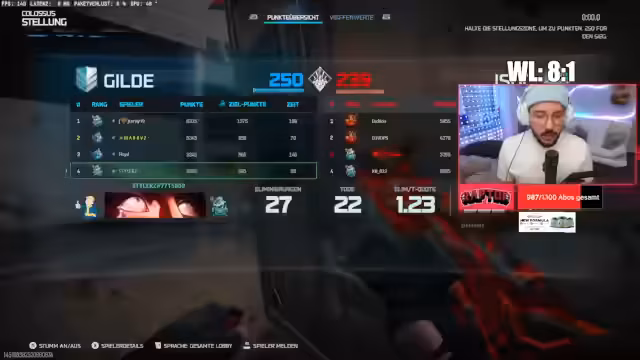 01:17:37Nach mehrmaligen Versuchen und technischen Problemen, wie fehlenden Einladungen und Datenbank-Verbindungsfehlern, startet endlich das Ranked-Spiel. Die ganze Truppe ist vereint, doch das erste Match endet abrupt, nachdem der Streamer gegen einen mutmaßlichen Cheater gespielt hat. Trotz dieses frustrierenden Starts bleibt die Moral hoch, da der Sieg gegen den Betrüger mit maximaler Rangpunktausbeute belohnt wird und das Team alsbald in ein neues Match startet.