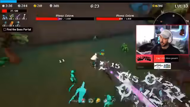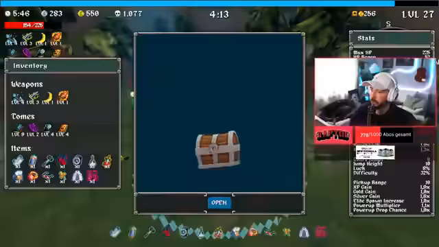 04:22:45Der Streamer startet eine Runde Megabong mit dem Fuchs-Charakter. Er sammelt Schlüsselgegenstände wie das Quantity Tome (erhöht Projektile) und kämpft gegen Bosse. Prioritäten sind XP-Gewinn, Difficulty-Steigerung für mehr Gegner und Belohnungen sowie das Balancing von Waffen-Upgrade-Chancen. Er erwähnt die Bedeutung von Boss-Kämpfen bei Minute 6 (Chaos-Turm/Schwarm) und kritisiert fehlende Meta-Elemente wie Refreshes für bessere Item-Werte. Die Runde zeigt ineffizientes Farmen aufgrund suboptimaler Item-Lucks.