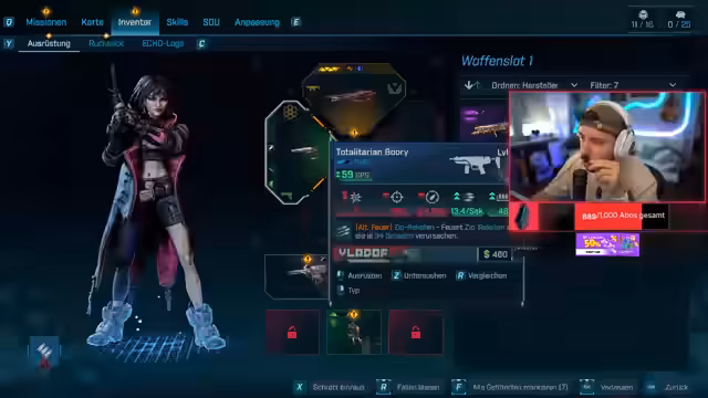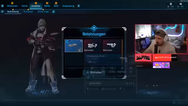 01:40:00Der Streamer erlebt einen schnellen Fortschritt im Spiel, indem er Gegner besiegt und reichlich Loot erhält, darunter lila und grüne Gegenstände sowie Schilde. Die Freude über den gefundenen Loot ist groß, und es wird versucht, alles aufzusaugen, was jedoch aufgrund eines vollen Rucksacks nicht möglich ist. Der Rucksack wird im Anschluss geleert, um Platz für neue Gegenstände zu schaffen. Eine lila Waffe, ein Vampiric Throwing Knife, wird gefunden, und es wird überlegt, wie man diese einsetzt. Die Heilungsspritzen geben Boni wie erhöhte Feuerrate und sofortige Schildwiederaufladung. Der Skilltree wird als gelungen hervorgehoben, und der erste Action-Skill wird freigeschaltet. Es wird überlegt, wie Skillpunkte am besten investiert werden, wobei die Wahl zwischen Lichtbogenklingen und Kanonen auf dem Rücken steht. Letztendlich werden die Kanonen ausgerüstet und Schusswaffen-Schaden sowie Feuerrate verbessert. Der Action-Skill wird auf die Taste G gelegt, was zu Diskussionen über die ungewöhnliche Tastenbelegung führt. Der Streamer erklärt, dass dies für ihn aufgrund der Handhaltung angenehmer ist, obwohl es unkonventionell erscheint. Während einer Zwischensequenz wird kurz über das Spielgeschehen gesprochen.