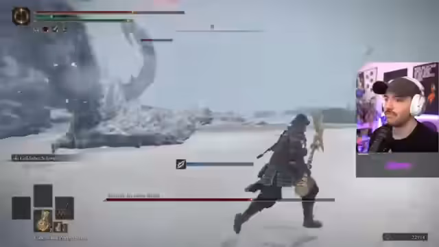 00:48:57Der Stream konzentriert sich nun auf den Bosskampf gegen den Frost-Drachen Radahn. Rappi beschreibt den Kampf als mühsam und frustrierend, da der Drache viel Frostschaden verursacht und Angriffe schwer einzuschätzen sind. Die Zuschauer helfen ihm im Chat dabei, die Attackenmuster zu erkennen. Nach mehreren Versuchen und einem besonderen "Trick" durch einen Trank, schafft er es schließlich, Radahn zu besiegen und den Kampf zu beenden.