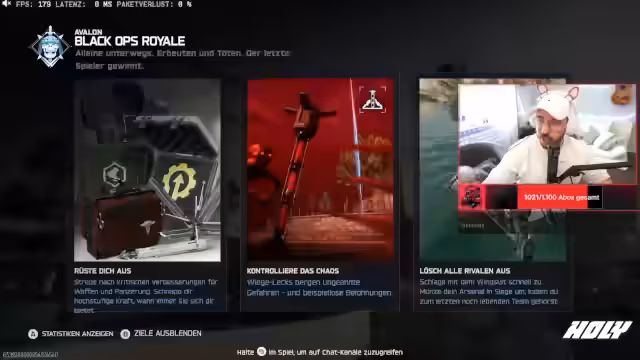 00:07:39Der Streamer begrüßt seine Community und startet in den Abend. Nach ersten technischen Anlaufproblemen und einem kurzen Ausflug in ein Spielloch, betritt er das Spiel Blackout. Zuerst geht es um die Ausrüstung; er findet eine Doppelmunition und ein Energiegetränk, was ihn sehr euphorisch stimmt. Er ist sichtlich begeistert von den initialen Funden und eilt in die erste Lobby, um sich in das Geschehen zu stürzen und das Spiel zu genießen.