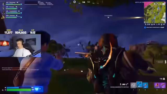 Es wurde eine Partie Fortnite gespielt, in der das Sammeln von Ausrüstung und Waffen eine zentrale Rolle spielte. Ein Fokus lag auf der Zusammenarbeit mit Teammitgliedern, die Ressourcen tauschten und Angriffe gemeinsam planten. Gegen Ende wurde der Druck durch einziehende Zonen erhöht und es kam zu mehreren engen Duellen um eine hohe Platzierung.