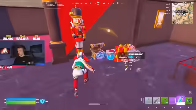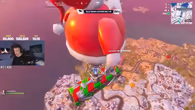 04:12:58Zu Beginn des Streams treten technische Probleme mit der Schussfrequenz bestimmter Waffen auf, insbesondere bei der Pumpgun, die nur einmal anstatt zweimal feuert. Der Streamer diskutiert Loot-Strategien und bemerkt finanzielle Schwierigkeiten im Spiel, nachdem er fälschlicherweise eine teure Waffe gekauft hat. Gleichzeitig analysiert er die Positionierung gegnerischer Teams und beobachtet einen Spider-Man-Skin mit niedriger HP. Währenddessen versucht er erfolglos, ein Auto zu beschädigen, und kommentiert die unnatürliche Bewegung eines Kim-Kardashian-Skins auf einem Dach.