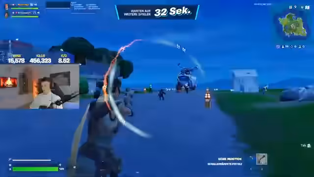 02:38:56Der Stream startet in einer leeren Lobby, was den Streamer frustriert. Er findet jedoch schnell einen Gegner und landet unter einem Haus. Es kommt zu ersten Feuergefechten, bei denen er Gegner eliminiert und sein Team looten will. Ein intensiver Kampf entbrennt, bei dem er mehrere Gegner im Nahkampf besiegt und dabei sehr enthusiastisch ist, mit Rufen wie 'Yes, yes, yes!'.