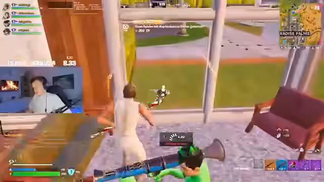 05:32:09Die Anfangsphase des Streams ist durch schnelle und unübersichtliche Kämpfe geprägt. Spieler landen in verschiedenen Bereichen wie Busch und Bunker, was zu sofortigen Konfrontationen führt. Der Streamer selbst erleidet rasch mehrere Todesfälle, während seine Mitspieler ebenfalls in heftige Feuergefechte verwickelt sind und Feinde ausschalten können. Die anfängliche Aktion ist chaotisch und erfordert schnelle Reaktionen, wobei der Fokus auf dem Überleben und dem Eliminieren der ersten Gegner liegt.