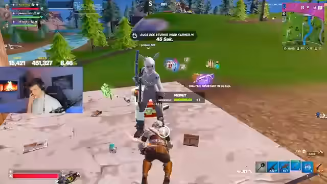 00:15:05Im Endspiel des Spiels ist der Streamer mit wenigen Treffern (HP) in einer schwierigen Position. Er muss sich gegen mehrere gegnerische Spieler verteidigen, während er gleichzeitig versucht, sein Team zu unterstützen. Die Situation ist angespannt, mit Spielern, die von verschiedenen Seiten angreifen. Der Streamer muss Entscheidungen treffen, ob er in bestimmte Gefechte involviert werden soll oder sich zurückzieht.