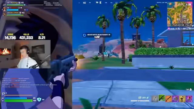 00:05:18Das eigentliche Gameplay beginnt mit dem Landen in der Taktik. Es kommt zu ersten Kampfhandlungen, in denen der Streamer Gegner in Tilted Towers identifiziert und verfolgt. Nach einem frühen Tod und Respawn wird erneut das Ziel verfolgt, mit Teamwork, um den Gegner zu eliminieren und Loot zu sichern.