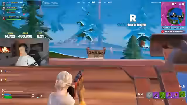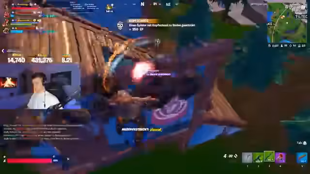 00:15:07Die Runde eskaliert zu einem intensiven Kampf gegen mehrere Gegner gleichzeitig, die sich in einem Gebäude versammelt haben. Es werden mehrere Aktionen wie das Platzieren von Bunkern, Feuern mit verschiedenen Waffen und das Erleiden von Schaden gezeigt. Der Streamer ist konstant unter Druck und muss sich durch taktische Manöver, wie Täuschungsbewegungen und das Nutzen von Mobilitätsgegenständen, verteidigen.