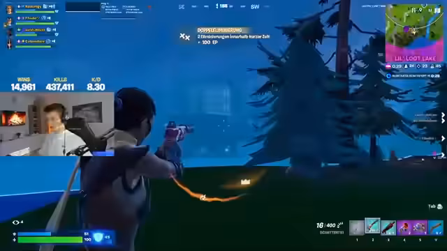 Es wurde eine erfolgreiche Runde im Fortnite-Team gespielt. Durch koordinierte Angriffe und klare Kommunikation wurde ein Gegner eliminiert und ein Sieg im Duell erriert.