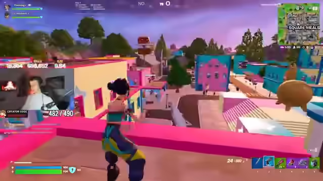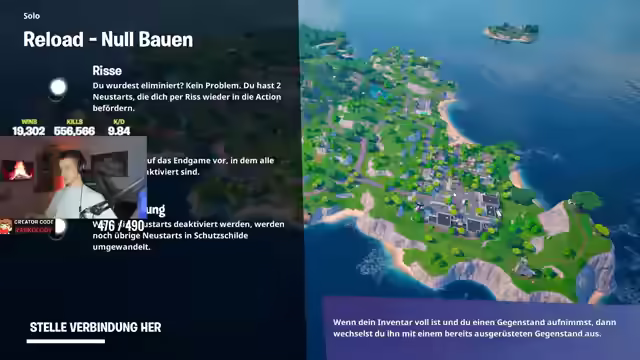 Ein Spieler erkundet die neue Oase-Map in Fortnite Battle Royale. Er liefert sich intensive Kämpfe mit anderen Spielern, kommentiert das Geschehen humorvoll und setzt taktische Manöver ein, um sich einen Vorteil zu verschaffen. Grappler und andere Hilfsmittel werden genutzt, um unerwartete Angriffe zu starten und die Gegner zu überraschen. Strategische Entscheidungen und Teamwork sind entscheidend.