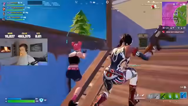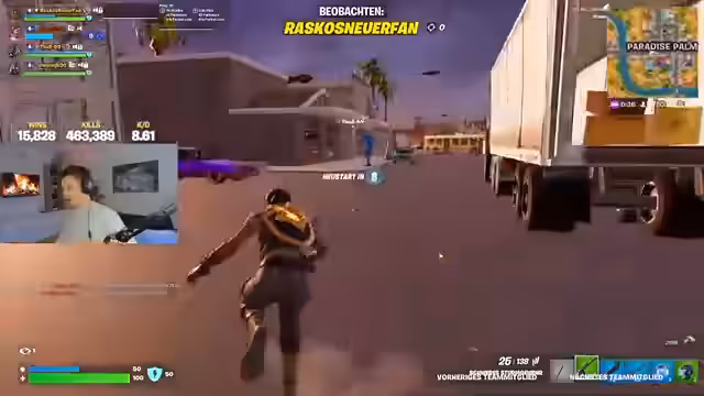 00:26:32Nach einer Eliminierung erwähnt der Streamer, dass er nach vier Jahren wieder besiegt wurde. Er drängt seinen Duo-Partner, einen gezielten Schuss abzugeben, und ist beeindruckt von einem Headshot-Snipe. Das Team nutzt einen Grappler, um sich gegenseitig zu helfen, und findet einen mythischen Gegenstand. Die Kommunikation ist sehr eng, da sie ständig auf Gegner achten und abwechselnd Loot sichern.