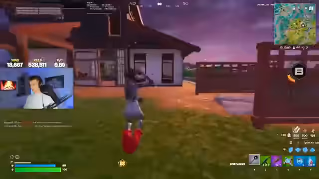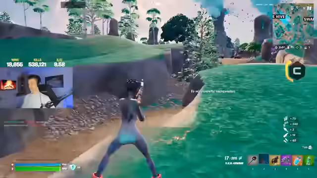 00:00:03Der Stream beginnt mit Begrüßungen von Zuschauern und dem Streamer, der mit der Routine eines Zero-Builds-Spiels gegen Squads startet. Er gerät sofort unter Beschuss und kommentiert den Angriff eines gegnerischen Spielers mit typischem Latein und lauten Reaktionen. Das Spiel beginnt hochdynamisch mit ersten Landeduellen und Überlebenskämpfen.