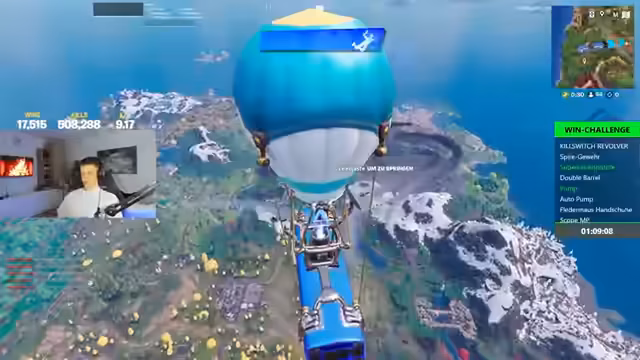 04:39:32Die Partie startet mit einem plötzlichen Jump-Scare, der den Streamer erschreckt. Nach der Landung beginnt die Suche nach Waffen, wobei der Drache und der Metal Grappler als Ziele identifiziert werden. Ein erster Todesfall ereignet sich durch einen Schuss auf das Inventar, wobei der Tod als 'Totfall am Erschrank' kommentiert wird. Die Ranked-Runde verläuft zunächst chaotisch, der Spieler erkennt aber schon jetzt, dass God Drops entscheidend für den Sieg sind.
