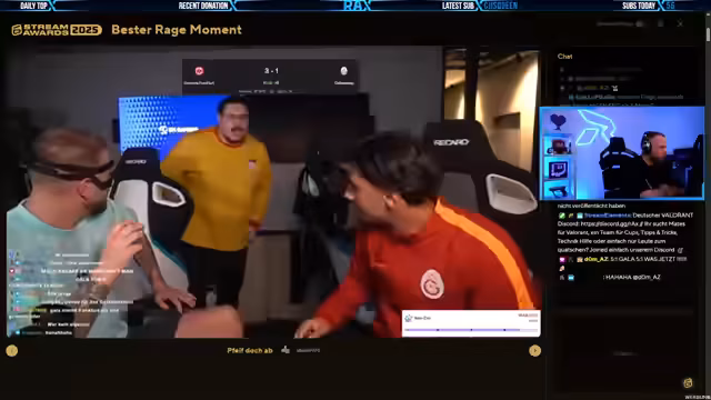 04:30:41Die ersten Clips der Kategorie 'Bester Rage-Moment' werden angeschaut. Es geht unter anderem um starker Wutausbrüche von Streamern wie Stimo und Kroko. Die Zuschauerliste variiert, was das Navigieren erschwert. Die Clips werden nacheinander durchgeklickt und kommentiert, wobei besonders die starken Reaktionen von Kroko und Eli hervorgehoben werden.