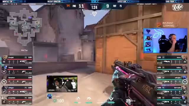 01:14:27Am Ende der zweiten Map Abyss kämpfen beide Teams um entscheidende Punkte. Karmine Corp, mit nur 5 Siegen auf der Map, steht unter Druck. Es kommt zu gefährlichen Retakes und klugen Plays, wie einem gefakten Smoke-Play von Miniboo, das Liquid in Schwierigkeiten bringt. Das Spiel bleibt bis zum Ende eng, und der Kommentar hebt hervor, dass Karmine Corp trotz des Rückstands nie aufgibt und weiterhin aggressiv agiert. Der Fokus liegt auf der kritischen Nutzung von Ultimates und der Fähigkeit, unter Druck Fehler zu vermeiden.